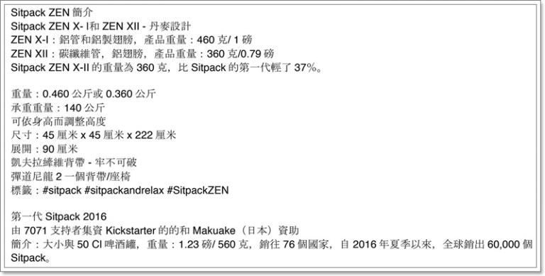 ( 12/30 集資結束前, Sitpack ZEN最低單價為 59 美金(約 1,770 台幣)早鳥價,