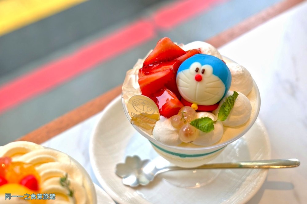 不但外型可愛,味道也一點都沒打折喔!底下層層堆疊著滑順鮮奶油、蛋糕、慕斯和果凍,再裝飾著新鮮水果。哆啦A夢查佛搭配葡萄柚/荔枝果凍和豔紅草莓,入口散發迷人奶香和清新果香,吃起來非常舒服,超Q的A夢也是用乳酪做成的,再細心用巧克力醬畫上傳神的眼睛,咬下相當綿密,也滿好吃的(咦?)。