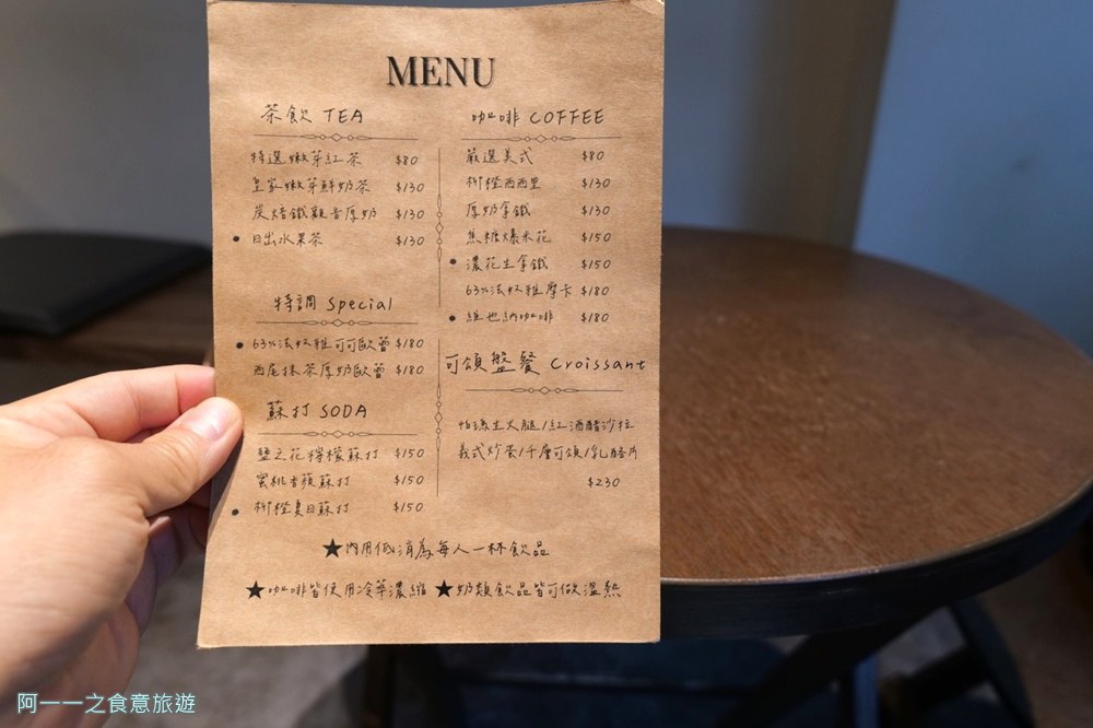 內用的低消需點飲料一杯,提供柳橙西西里、濃花生拿鐵等多種特調咖啡,好茶和清涼氣泡飲,飲料喝完也有自己取用的開水,如果想吃正餐,也供應鹹食的可頌盤餐,可以一次滿足。