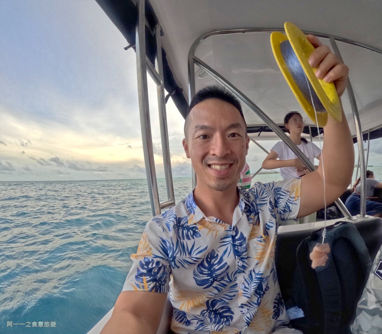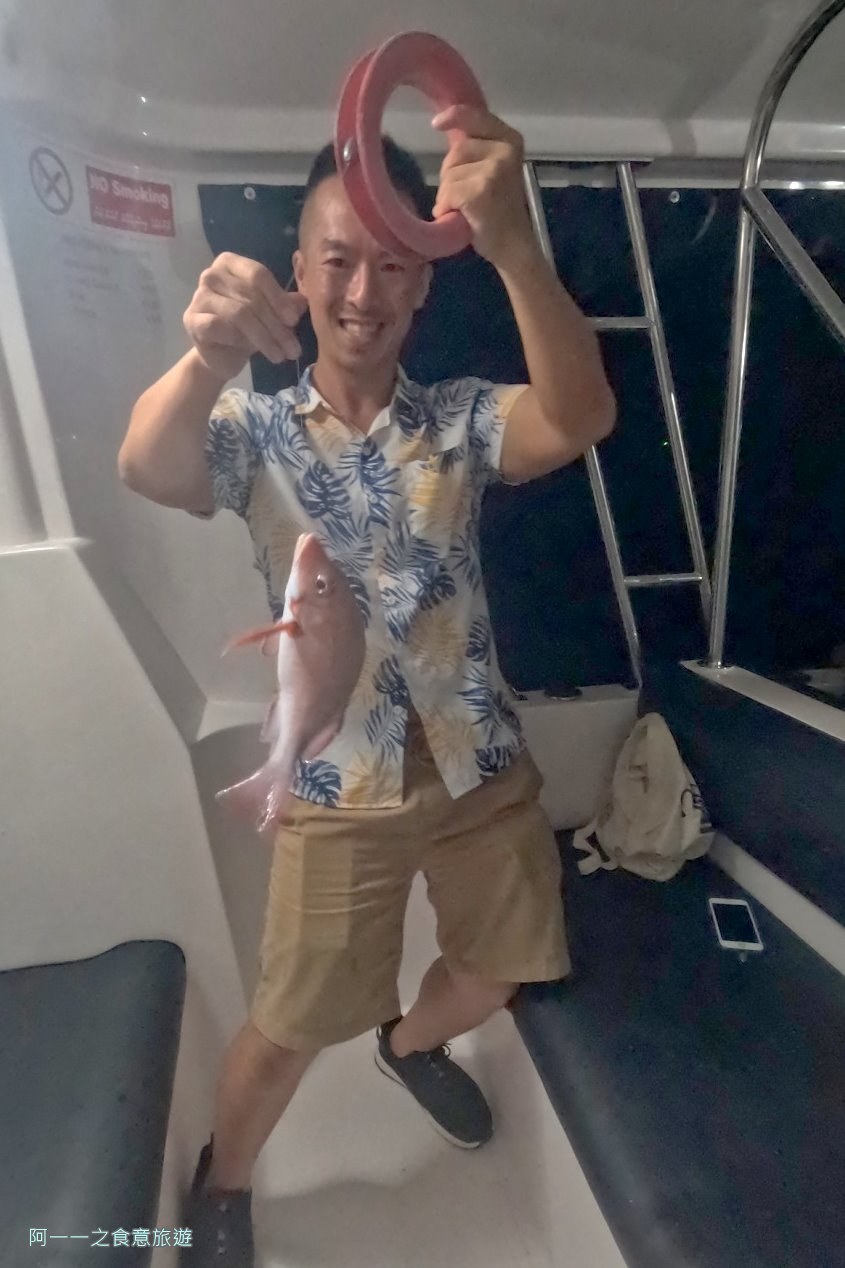 隨著天色漸漸變暗,船長又載我們開往另一個魚場,這個地方海底魚群非常多,大家都一個個開心釣到魚,戰利品越來越豐富,我雖然也有釣到魚的感覺,魚去拉扯釣魚線的力量真的相當大,不過兩次拉上來都只剩下空空的釣魚線,魚鉤和魚餌就被魚帶走了,感謝朋友很給力,讓我也能跟魚魚開心合照。