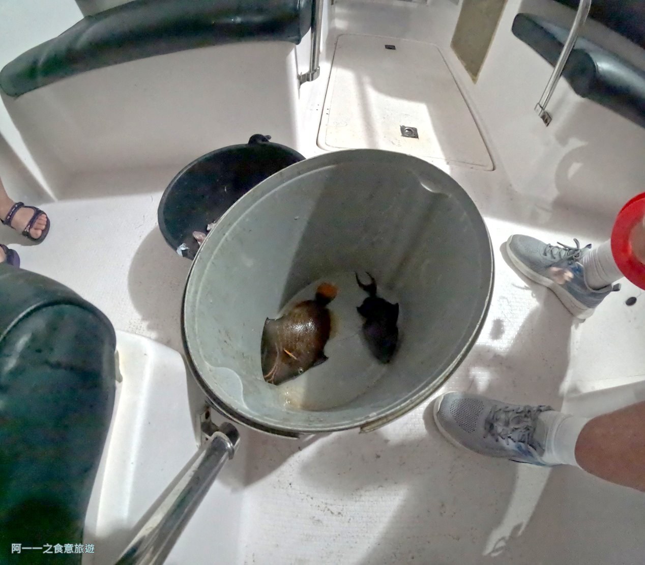 接下來大家都很認真在釣魚,要去感受釣魚線的細微顫動,當震動幅度變大的時候,就可能有魚咬到魚餌了,這次就可以把線收上來,因為魚會努力想掙脫,為了避免釣魚線被咬斷,收線的速度要慢慢的,接下來陸陸續續有團員釣到魚,釣到的魚給船員看過拍照後會統一收集在一起。