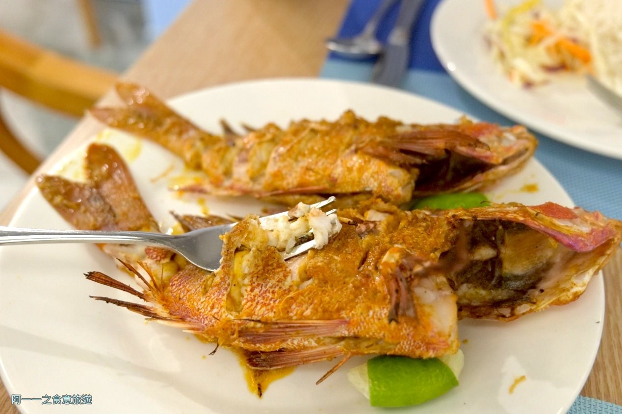 夜釣結束後,船長就會載大家回到碼頭,會跟大家約定下來飯店餐廳享用鮮魚的時間,這次團員都滿厲害的,所以每個人可以分到一整隻魚,搭配簡單的白飯和青菜,剛釣上來的魚沒有太多的調味,只有簡單的乾炸過,裡面肉質依然細緻多汁,能感受滿滿大海的鮮味,讚喔~