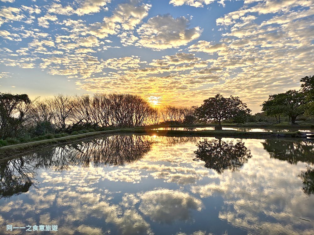 樹影、水池、落日形成了美麗倒影,