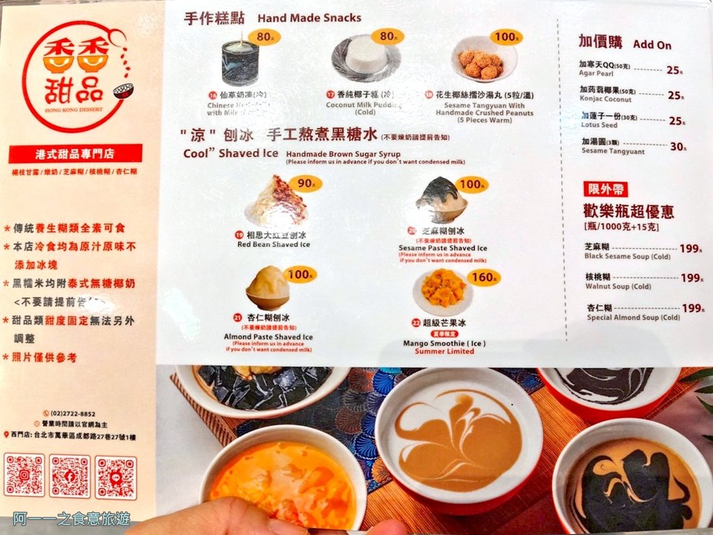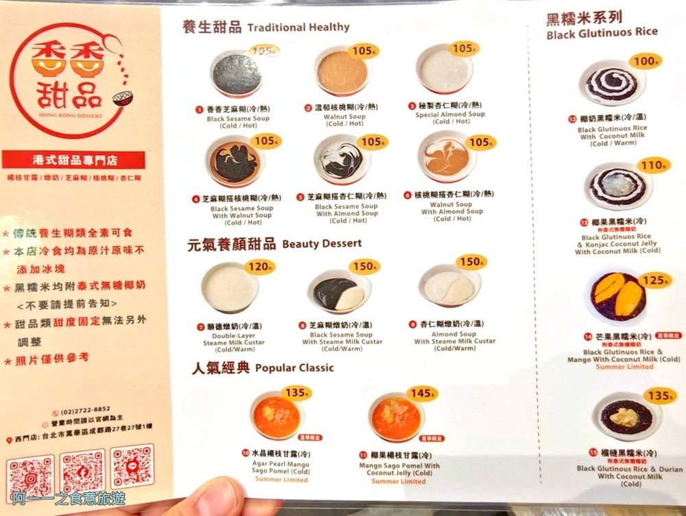 如果你也跟我一樣,喜歡探索特色美食,或是想在西門町找個地方享受下午茶,香香甜品絕對是你的好選擇,阿一一真心推薦這間店給港式甜品愛好者,還有想找地方放鬆、美拍的朋友,走吧!一起去香香甜品享受甜蜜的港式滋味!