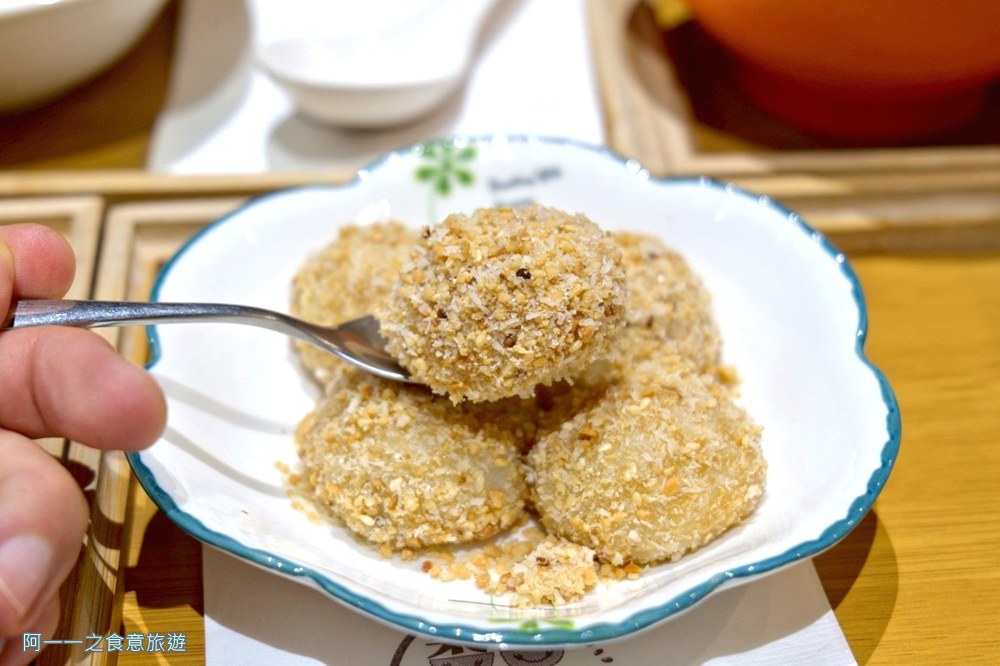 這道花生椰絲擂沙湯丸也是必點,湯圓是點後才現煮的,再一顆顆手工細細裹上花生椰絲粉,每一顆都圓潤飽滿,剛送上來時還熱騰騰的,咬下去Q中帶有彈性,花生的濃郁香氣和酥酥顆粒感,加上椰絲的南國風味,簡直是絕配!內餡也包了會爆漿的滿滿芝麻餡,甜而不膩,吃起來相當有飽足感,喜歡湯圓的朋友,這道你一定要試試看!