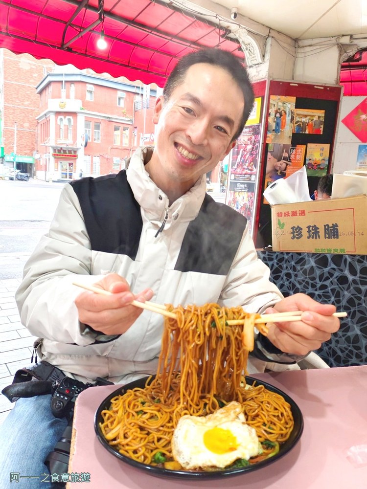 首先直接是重頭戲,當我的「海鮮炒麵」一上桌,眼睛都亮了!大大盤子堆得像小山一樣的麵條,一份不到100元,裡面吃得到Q彈蝦仁、花枝、新鮮蔬菜,還有一顆嫩嫩半熟蛋,筷子一戳瞬間流出金色蛋黃,光看就讓人食指大動!