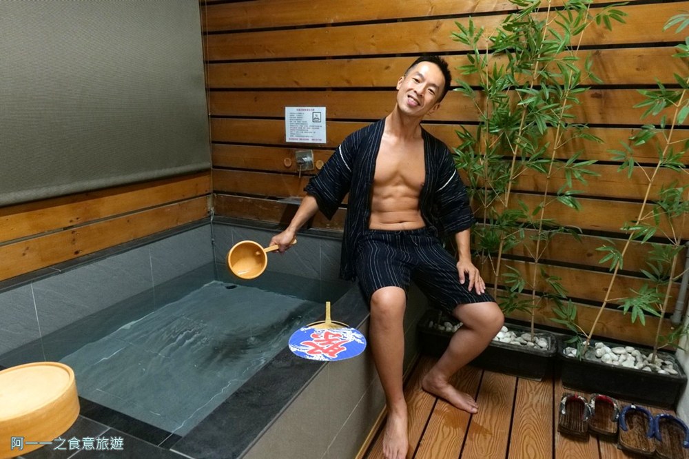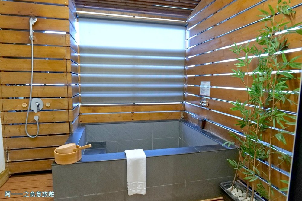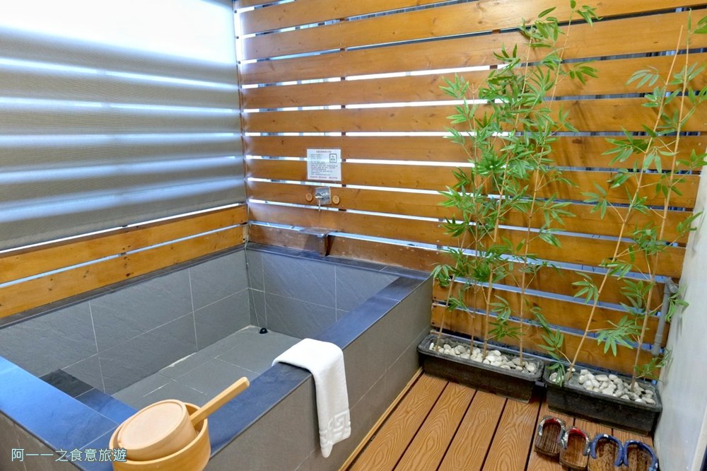 接著就是湯旅的最大賣點,推開拉門,房間裡居然藏有日式風大湯池,搭配美美的竹子造景和半露天淋浴區,真的讓人一秒到日本,很適合穿著浴衣拍美照。