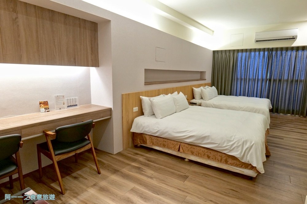 接著來到今天住的湯旅,是中正藏書館的熱門房型,空間第一眼看起來沒樹旅大,不過等下還藏有大賣點,採一大床的格局(兩張單人床合併),床墊支撐感不錯,躺起來很舒服。
