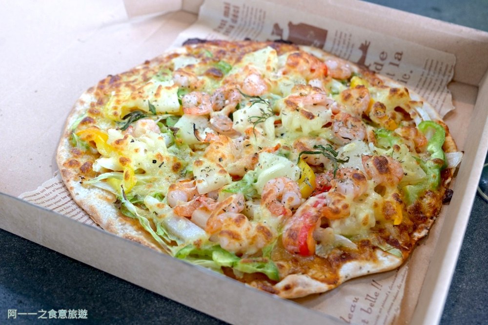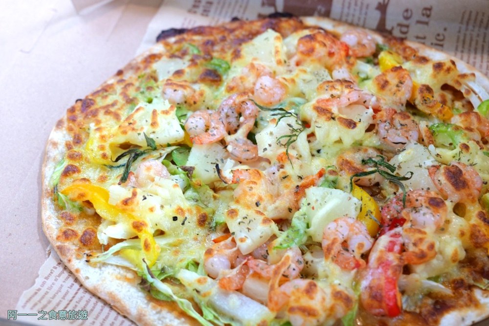 它的餅皮是薄皮的,咬下去口感很香酥,調味不重,能感受蔬菜清脆、鳳梨酸甜和蝦子的鮮,雖然我覺得起司有點少,少了披薩拉起來牽絲的爽度,不過滿滿好料大口吃還是超滿足!