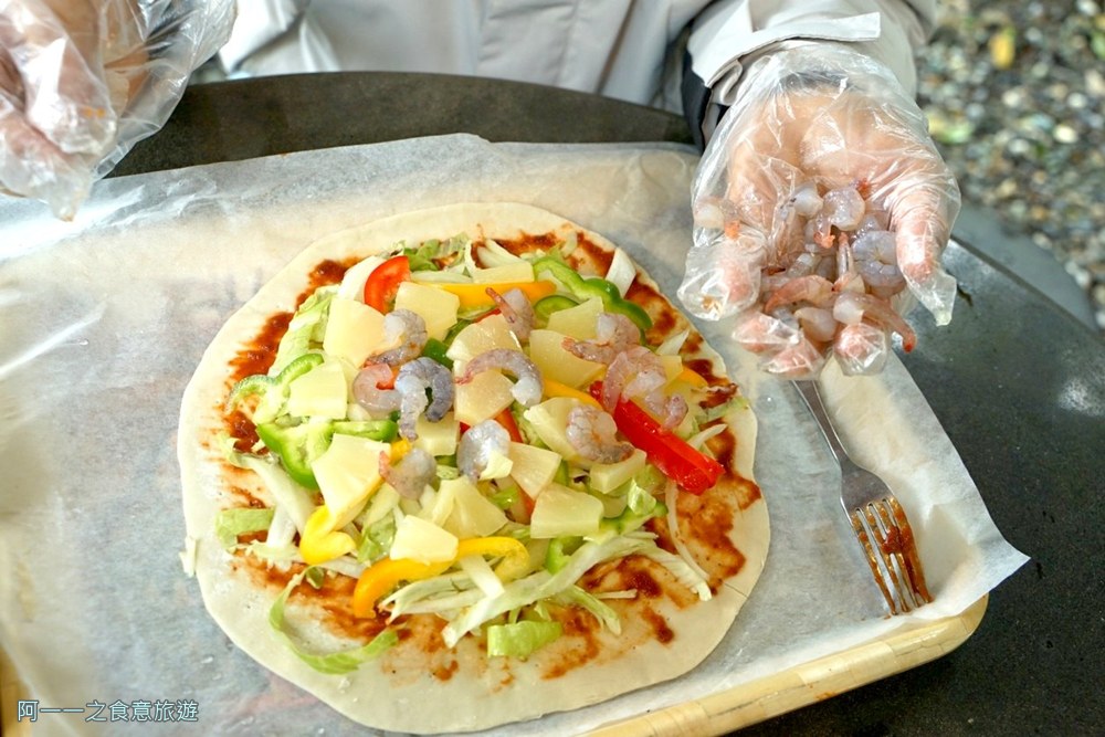 接著是期待的自己做披薩,餅皮的部分已經幫你準備好了,先用叉子將餅皮插上透氣孔,接著塗上醬汁,我點的是鳳梨鮮蝦口味,提供的配料非常豐富,有大塊鳳梨和滿滿蝦蝦,再把起司豪邁的灑上去再加上香草粉就可以準備拿去烤了。